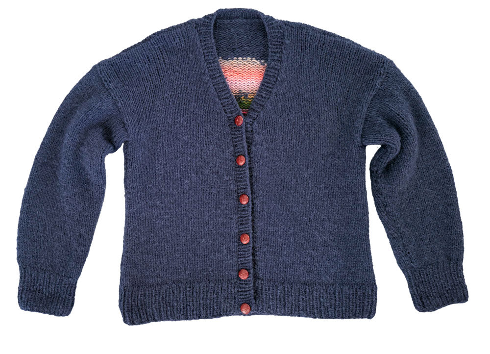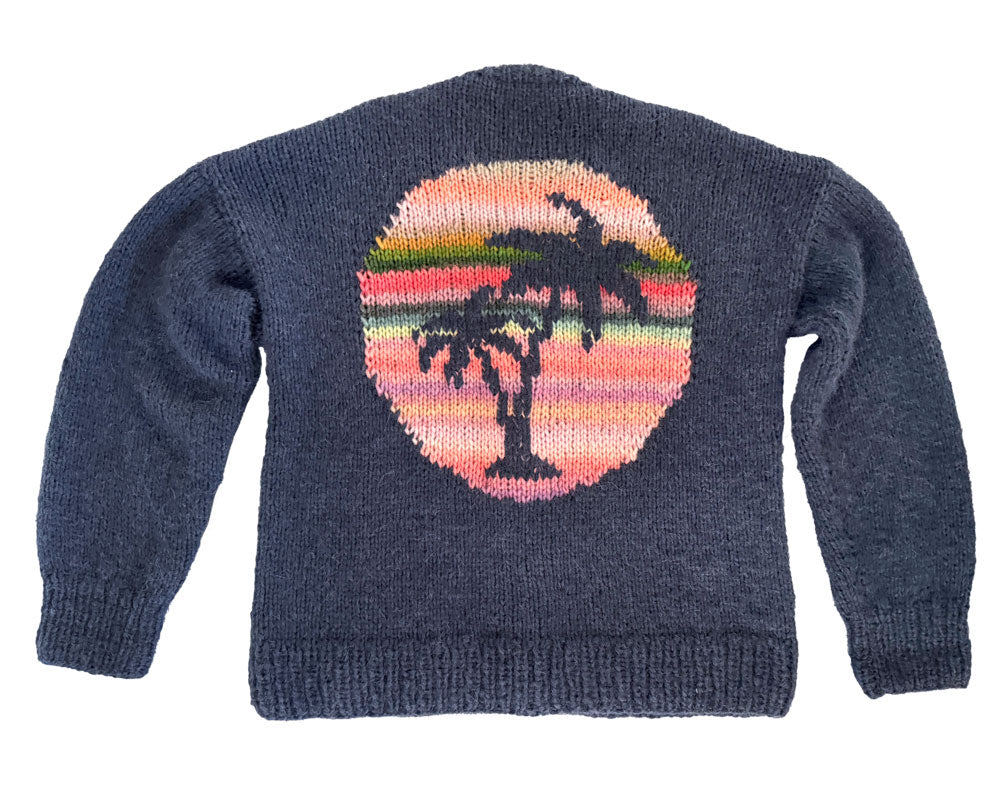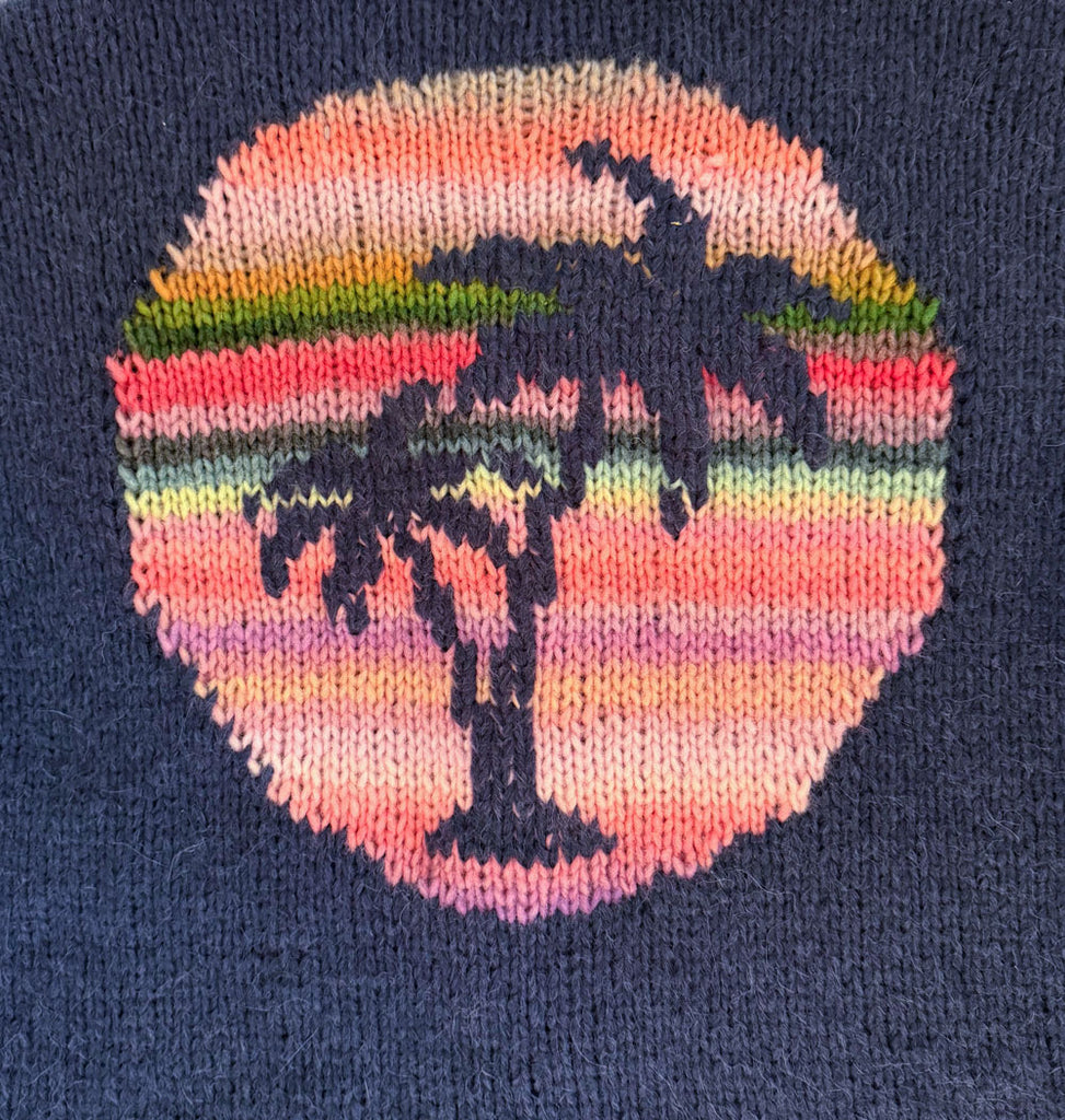 Der Sehnsuchtsort unserer Familie ist wohl Kalifornien - das Licht, die Wellen, die Sonnenuntergänge, die Milkshakes! Und die Pancakes. Aber auch Ursprungsort des Skateboards und so viel wunderbarer Musik. Ein Kalifornien, das es so natürlich nur in unseren Köpfen (und Herzen) gibt. Diese Jacke ist die Übersetzung unserer Kalifornien-Nostalgie in Strick, mit dem wohl schönsten palmengesäumten Sonnenuntergang, den man mit Maschen erschaffen kann.